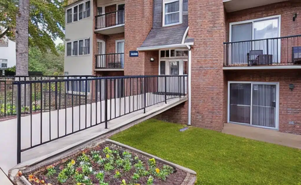 A brick apartment building with balconies, large windows, a ramp with black railings for accessibility, a garden bed with flowers, and a small grassy area in front.