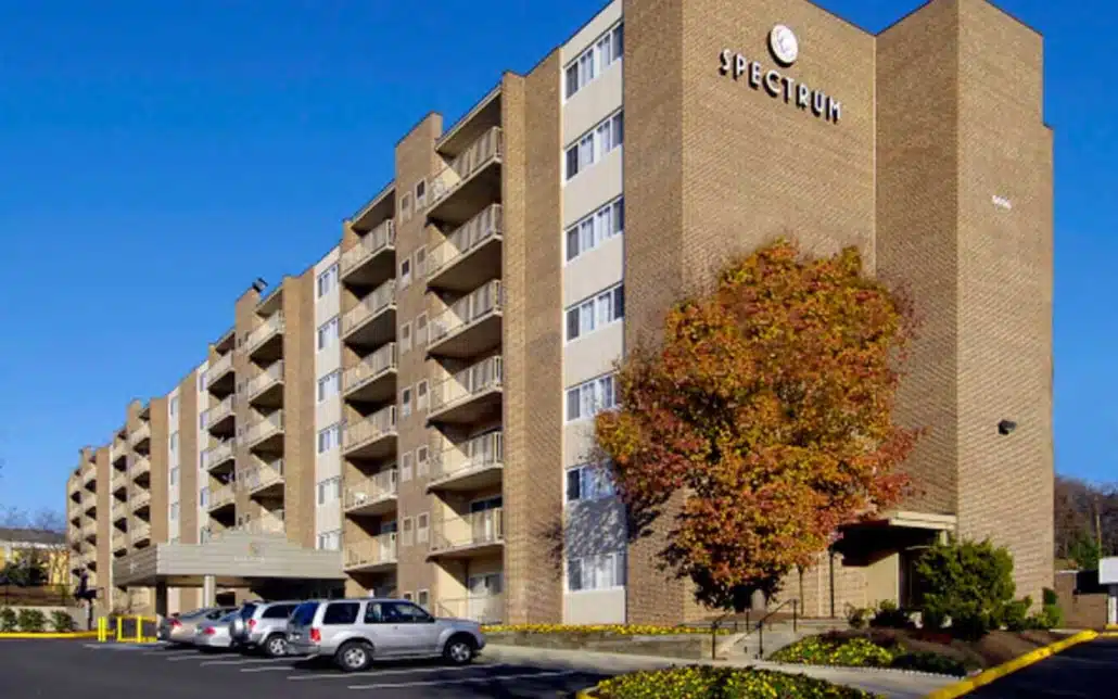 The Spectrum is a high-rise apartment community with 100 apartments near the intersection of Leesburg Pike and South Walter Reed Avenue. The pet-friendly community includes a pool, fitness center, controlled access, in-unit laundry, a free shuttle to the Metro, and onsite parking.